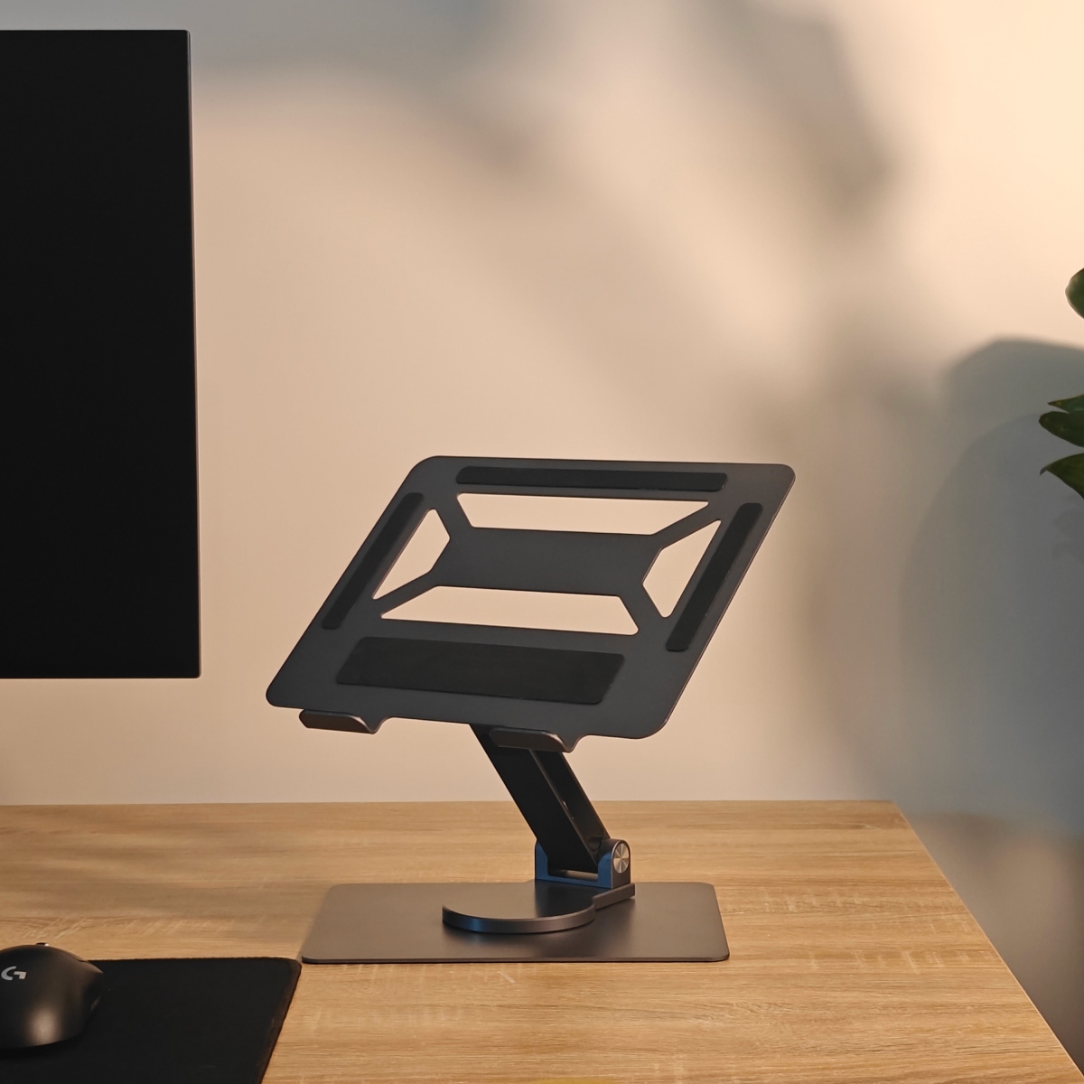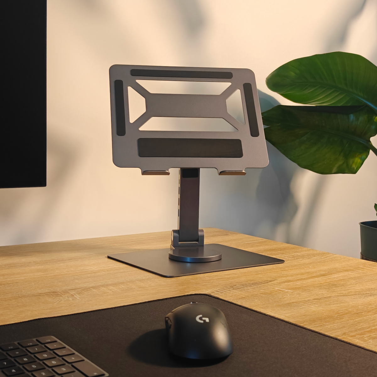 Met de geïntegreerde 5-poorts USB-hub koppel je moeiteloos al je randapparatuur, zonder kabelchaos of externe dongles. De verstelbare hoogte, het 360° draaibare platform en de open aluminium constructie zorgen voor optimale ergonomie en een koelere laptop tijdens intensieve sessies.