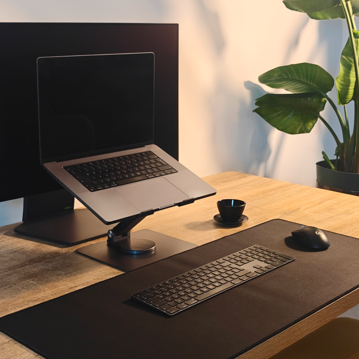 Het 360° draaibare platform in combinatie met de traploos verstelbare hoogte geeft je volledige vrijheid in positionering. Zo creëer je een comfortabele, ergonomische werkhouding die focus en productiviteit ondersteunt tijdens lange werksessies.