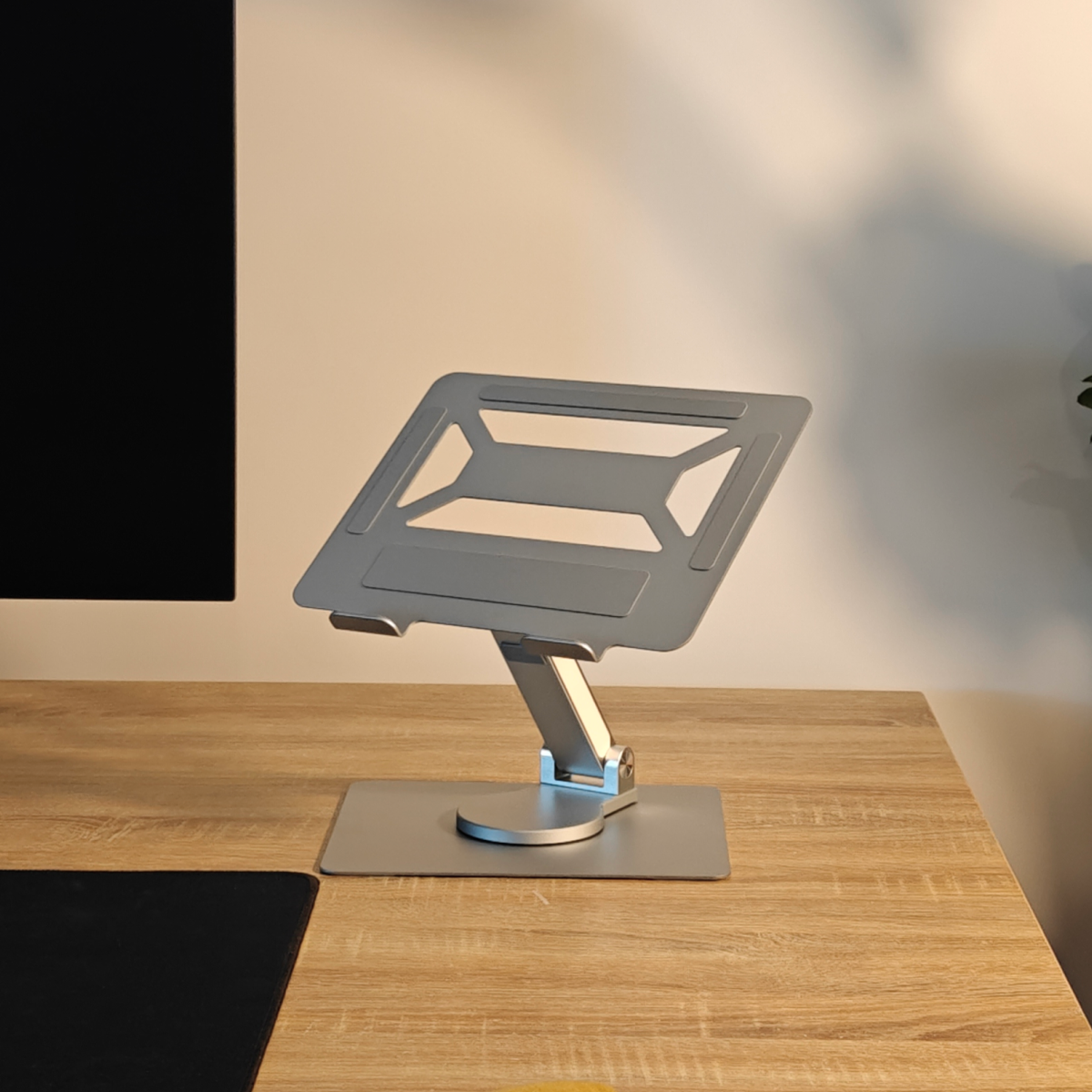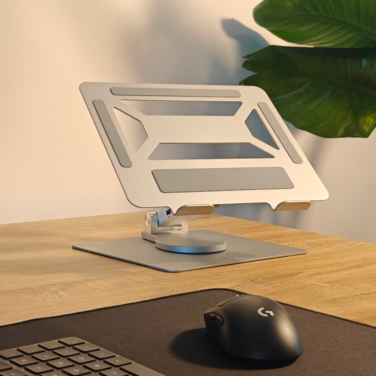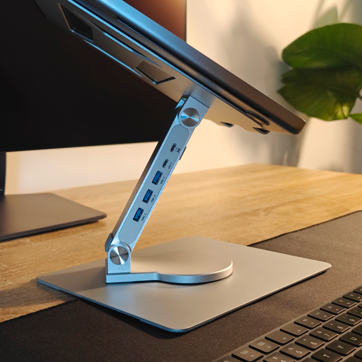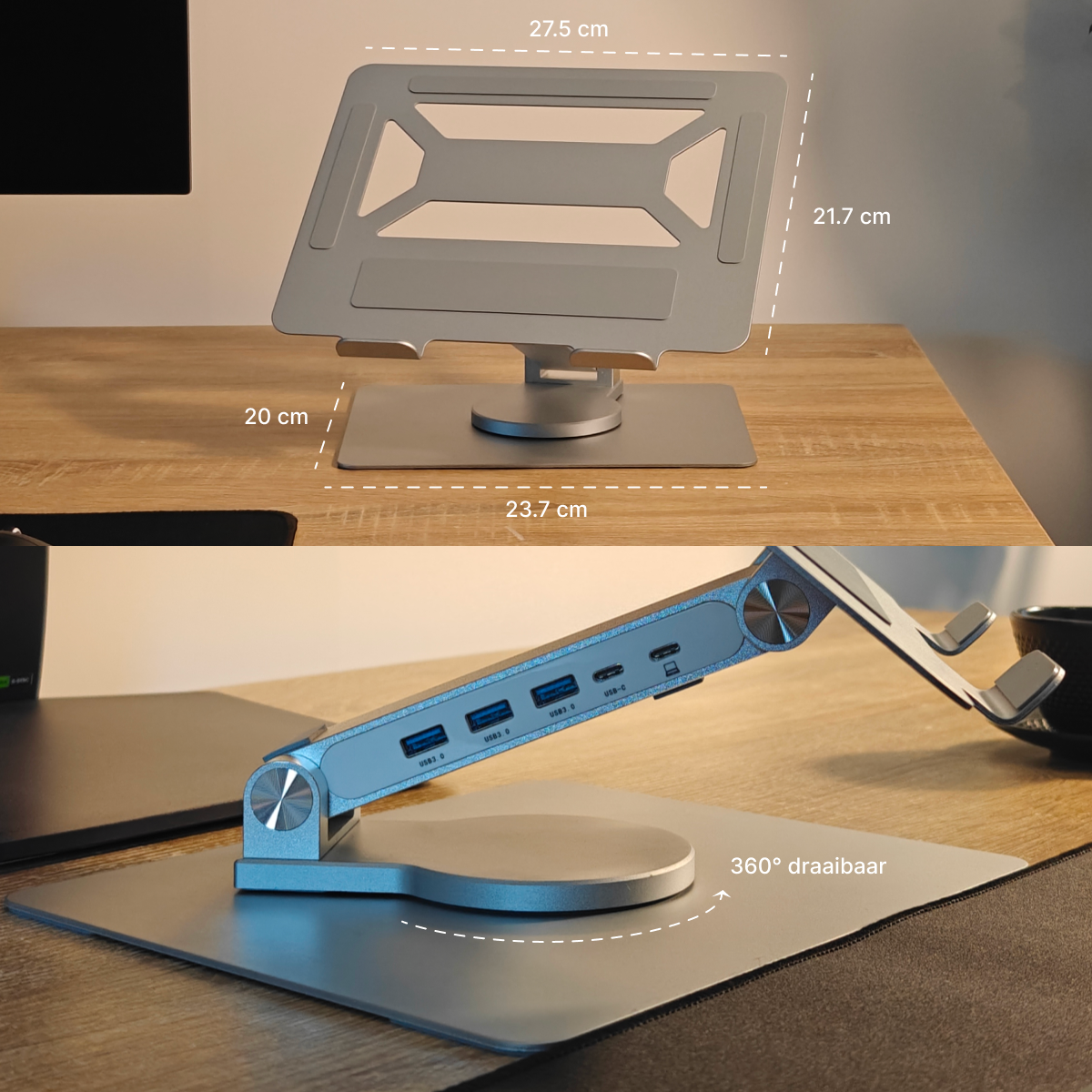 Met de geïntegreerde 5-poorts USB-hub koppel je moeiteloos al je randapparatuur, zonder kabelchaos of externe dongles. De verstelbare hoogte, het 360° draaibare platform en de open aluminium constructie zorgen voor optimale ergonomie en een koelere laptop tijdens intensieve sessies.